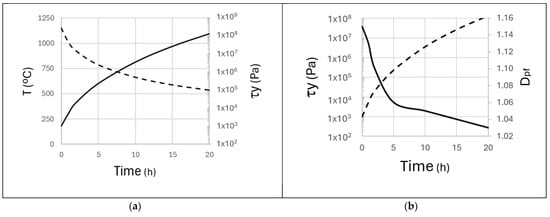 Temporal evolution of an unconfined lava flow. (a) Change in lava properties over time, showing the dashed line the temperature (T,) and the solid lines yield strength (τy). (b) Evolution of flow complexity, where the solid line is the prefractal dimension (Dpf) and the dashed line is the yield strength (τy): h = 10 m; α = 2°; Cc = 0; T0 = 1423 K (typical eruption temperature for basaltic lava); Tatm = 293 K; Ea = 300 kJ/mol; clava = 1300 J/kg K; ε = 0.95.