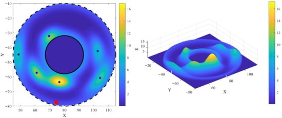 Schematic of potential field at roundabout intersection. (The (left) figure is a two-dimensional potential field diagram of roundabout intersection (red dots represent the tested vehicles, blue dots represent the surrounding vehicles), and the (right) figure is a three-dimensional potential field diagram of roundabout intersection).