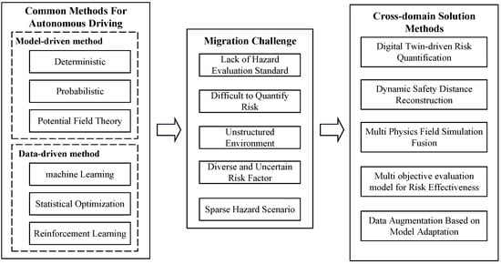 Therefore, to address the above challenges, cross-domain knowledge transfer and digital twin methods can be adopted to solve the problems of scene adaptation, risk objective differences, and data scarcity. In terms of scene adaptation, Ahmed [48] designed a sensor fusion scheme for agricultural vehicles, which spatiotemporally aligns visual images, LiDAR point clouds, and spray system data; fuses multi-modal features through convolutional neural networks and Transformers; suppresses the interference of crop occlusion and dust noise; and extracts agricultural-specific features such as crop row spacing and obstacle geometric features to improve the obstacle recognition accuracy in complex farmland environments. Cui [49] used the idea of multi-physical field fusion to construct a three-dimensional feature matrix from multi-sensor data, used an autoencoder to eliminate electromagnetic interference noise, and integrated a graph neural network to model the data correlation features of load–vibration–leakage to solve the problem of data distortion in industrial and mining environments. For the challenge of risk objective differences, Zhong [50] designed an obstacle avoidance-spraying dual-objective function, introduced a non-dominated sorting genetic algorithm, took collision probability and spraying uniformity as the core optimization objectives, and trained a Pareto optimal solution set through historical farmland operation data to achieve the dynamic balance between obstacle avoidance strategies and operation quality. Peixoto [51] combined physical models with data-driven models, took leakage risk probability and transportation task interruption cost as dual objectives, and dynamically adjusted the weight coefficients of safety redundancy and task continuity through reinforcement learning. Wang [52] adopted digital twin technology to construct a multi-objective evaluation model of fault risk-operation and maintenance efficiency for the suspension system, used the twin to simulate the task delay losses in different fault scenarios, incorporated the suspension failure probability and operation and maintenance interruption duration into the risk function, and achieved the quantitative balance of multiple objectives through gradient boosting decision trees. In response to the problem of data scarcity, Ankrah [53] adopted a domain adaptation algorithm to transfer the fault diagnosis model of autonomous vehicles to special engineering vehicles. By minimizing the feature distribution difference between the source domain and the target domain, the model was pre-trained with a small amount of fault data from special engineering vehicles to solve the problem of scarce suspension failure data. Mehta [54] designed a lightweight model for few-shot learning and improved the model’s generalization ability for scarce fault modes through meta-learning algorithms. Figure 4 illustrates the migration roadmap for scenario hazard evaluation methods.