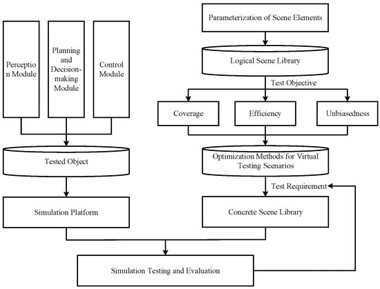 With the rapid advancement of intelligent transportation technologies, the automation and intelligence of wheeled vehicles have become the core direction of industry transformation. From autonomous driving vehicles to specialized vehicles such as agricultural vehicles, engineering vehicles, and special operation vehicles, various wheeled vehicles are continuously breaking through the boundaries of autonomous decision-making capabilities through sensor fusion, control algorithm optimization, and data-driven technologies [1,2,3]. However, the safety and reliability of automation technologies directly determine the upper limit of equipment automation and operational scenario safety, urgently requiring systematic testing to verify technological maturity. Different from the testing model of traditional vehicles focusing on mechanical performance, the testing of automated wheeled vehicles requires constructing virtual simulation environments to mimic the complex and diverse operational scenarios in the real world, and evaluating system safety through digital means [4]. As a pre-testing link for physical vehicle testing, scenario virtual testing is a technical method that reproduces or generates various typical and extreme scenarios in a virtual environment and verifies the vehicle’s behavioral logic and safety performance under different working conditions through digital simulation. It can avoid physical vehicle damage and safety risks in high-risk scenarios and is particularly suitable for reproducing extreme working conditions and high-frequency testing verification, thus having become the core support for the technological iteration of autonomous vehicles [5,6,7]. Currently, research on scenario virtual testing for autonomous driving vehicles mainly focuses on three key technologies: scenario hazard evaluation, hazardous scenario generation and generalization, and accelerated evaluation. Risk is assessed by quantifying traffic conflict probability and collision severity, scenario libraries are expanded using algorithms such as generative adversarial networks (GANs) and Variational Autoencoders (VAEs), and the probability of hazardous scenarios is increased through importance sampling (IS) and reinforcement learning (RL). This has formed a technically symmetric framework covering urban roads and highways, i.e., the consistency and universality of testing logic and evaluation indicators in similar scenarios.