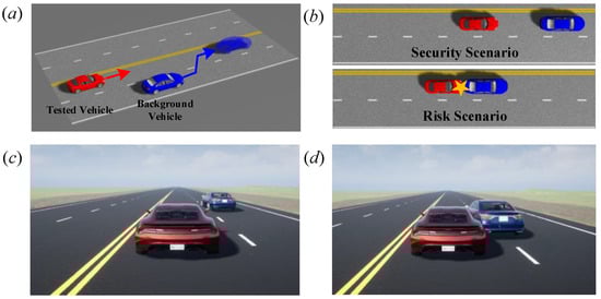 Scenario virtual testing simulation platform. ((a) shows a concrete scene using the cut-in scenario as an example, arrows show the direction of vehicle travel, (b) shows a schematic of security and risk scenarios, a star shows that a risk scenario has occurred, (c) shows the testing of a security scenario on a simulation platform, and (d) shows the testing of a risk scenario on a simulation platform).