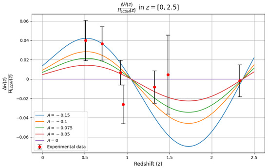 Our procedure is as follows: First, we solved Equation (10) (with taken to be the same as in the fiducial cosmology) in order to obtain H(z) predicted by the back-reaction model. From this, we can plot the resulting function for the model, together with the observational values and error bars shown in Table 1. However, to plot the quantity predicted by the back-reaction model, the parameters in Equation (7) must be fixed. As mentioned earlier, the phase is fixed such that is zero at redshift . The amplitude A and the “frequency” f remain to be fixed. We will focus on the values of the amplitude, which are of the order of . Larger amplitude values would give rise to excessively large oscillations of the Hubble parameter, whereas smaller values would not lead to observable differences compared to our fiducial cosmology. We cannot determine the amplitude from the considerations in Section 2 because this would require a non-perturbative calculation that has not yet been achieved. However, the considerations in Section 2 imply that the frequency of oscillation is set by a fraction of the Hubble rate. Hence, we would expect that a non-fine-tuned frequency would correspond to a value of f with an order of magnitude approximately equal to one.
