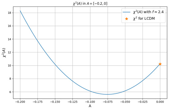The expression to be minimized is the of (which expresses the relative difference between the proposed model and the standard cosmological model as a function of redshift) with respect to the experimental data from DESI DR2. As described previously, the DESI experimental results were interpreted in terms of , and the error propagation was calculated. Some minimization results lead to a shape that is more in line with the one indicated by the DESI data than others. However, in practically all the cases considered, for the mentioned initial values, the obtained were smaller than that of the CDM model. However, these analyses were restricted to amplitudes with an order of magnitude or smaller. For larger values of A, the fit is poor. This is shown in Figure 2, where the value of is plotted as a function of the amplitude. From this same figure, we can also see that for values of the amplitude higher than zero and lower than , the back-reaction model provides a fit worse than the standard model (which is recovered for the value , the star in the plot). We can also see from Figure 2 that the minimum value of the is shifted with respect to the CDM value. A similar plot using the data from DR1 is presented in the Appendix A. By comparing the as a function of the amplitude for the two datasets, DR1 and DR2, we see that the minimum value of the does not change significantly. However, from the overall analysis, we obtain that the frequencies that tend to provide best fitting for the DR2 data are generally smaller than the ones that fit better the DR1 data. This general tendency seems to agree with the results of Ref. [100]. While the error bars still do not allow us to conclude that our model performs better than CDM, these results can be viewed as an indication of the importance of further studies of this model rather than a firm statistical conclusion.