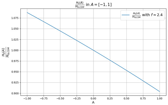 From all the results of our minimizations, the highest value that was obtained was , which was achieved for and . For the amplitude , for instance, we obtain ; that is, it is basically indistinguishable from . Nevertheless, it may be possible to solve the Hubble tension given sufficiently high absolute values of the amplitude. However, from Figure 1 we can see that such high absolute values of A do not provide a good fit to the DESI data. If we extrapolate and investigate the Hubble constant value for an amplitude as low as , we obtain , considering .