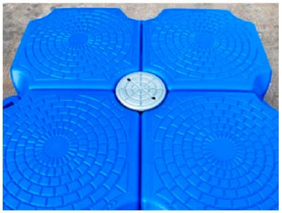 The pontoon plays a vital role in the overall system. It serves as both a mounting surface for a PV panel and a source of buoyancy required to keep the PV afloat. Pontoons typically withstand the majority of environmental loads and provide the primary attachment point for mooring lines. Consequently, pontoons must exhibit excellent resistance to UV irradiation, biofouling and corrosion. The most popular material used is HDPE due to its durability, mechanical strength and UV resistance [25]. Alternatively, Glass-fibre-reinforced plastic (GRP) can also be employed [26]. An example of such a pontoon is in Figure 3.