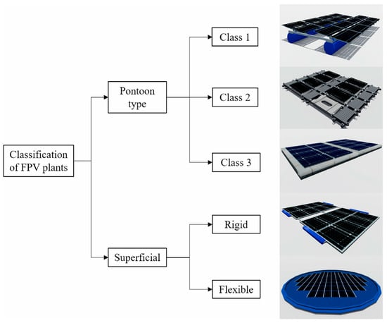 Figure 5 demonstrates the systemic classification of FPV. They are broadly classified into two types: Pontoon and Superficial [25]. Pontoon-type floating photovoltaic systems (FPVs) provide a stable platform to support photovoltaic (PV) panels. A pontoon-type floating solar system raises the location of solar panels above the water’s surface. The motion response of an FPV is heavily characterised by the type of pontoon and the connection mechanisms that exist between the pontoons. Additionally, the pontoon is subjected to harsh environmental loads. Hence, the design of the pontoon and the type of connection need to be considered. Consequently, the pontoon-type FPV is further classified into three categories: Class 1, Class 2, and Class 3.