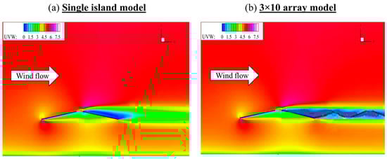 The computational methodologies discussed above enable investigations of flow structures. Understanding these flow patterns is crucial for predicting forces, optimising panel arrangement, and ensuring structural integrity. To understand the flow physics, it is essential to understand the differences between a single FPV module and an array. A CFD analysis [38] discusses the differences in flow patterns between a single FPV module and a 3 × 10 array. Figure 8 illustrates the contrasting flow patterns of a single FPV module and an FPV array.