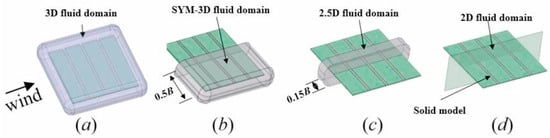 A common strategy for reducing computational geometry involves analysing a 2D section of a 3D domain. This strategy, adopted by [39,40], offers computational advantages, reducing simulation time by orders of magnitude compared to a 3D domain. While this assumption provides a fundamental understanding of boundary layer development and flow separation, it fails to capture three-dimensional effects such as edge flows and vortices, which influence spanwise pressure distributions and, consequently, aerodynamic loads. The limitations of dimension simplification are investigated by [41]. Figure 9 illustrates the various types of computational domains examined by the study.