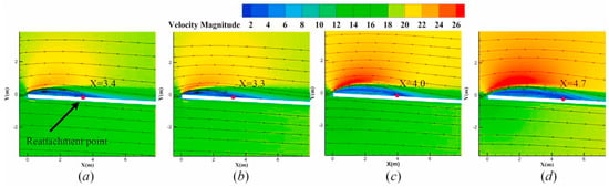 The analysis revealed that the 2D domain failed to capture any 3D effects. The 2.5D domain captured the spanwise turbulence but was unable to capture the tip vortices. Figure 10 illustrates the reattachment point for different domains. Compared to the 3D domain, reattachment of flow is delayed in the 2D and 2.5D domains. Consequently, the SYM-3D domain accurately predicts the reattachment point, which enables the accurate calculation of aerodynamic forces.