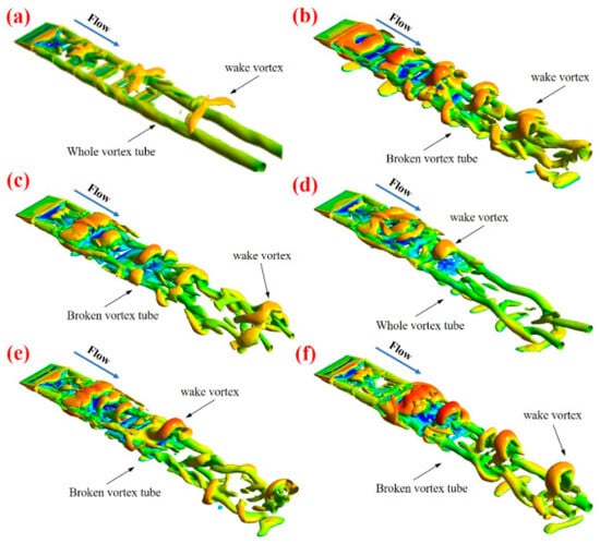 The vortex structure around the solar panel for arrangement in Figure 11b (a) array a (b) array b (c) array c (d) array d (e) array e (f) array f [37].