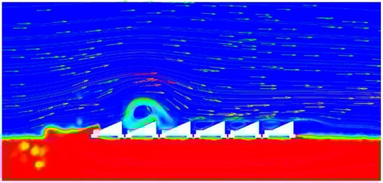 A CFD analysis by [46] focused on a 2D study on a single row of an FPV using ANSYS Fluent, investigating the effect of combined wave and wind loads on the FPV. Figure 13 illustrates the wave and wind streamlines. The findings revealed that the wind’s effect causes significant wave decay, resulting in greater pressure at the front of the FPV platform compared to the rear. However, to understand the true nature of loads acting on the FPV, a 3D geometry and domain must be taken into consideration.