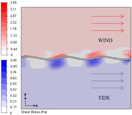 A comprehensive study by [53] investigated the forces acting on a distinct, thin film flexible FPV, under the influence of wind and current. Figure 14 illustrates the shear stress acting on a thin film FPV. The study highlighted the yielding nature of a thin, flexible composite FPV, flexing with waves rather than opposing them. The results revealed that the mooring load was significantly reduced for the same installation rating as a wave energy converter. However, in extreme weather conditions, the PV array was fully submerged, rendering it unsuitable for open-sea environments. Previous research [54] investigated the effect of draught, water velocity and number of bodies on the drag of FPV structures. Furthermore, the flow field characteristics around FPVs were examined with ANSYS Fluent. Results indicated that the draught has a significant contribution to the drag experienced by the system compared to the water velocity. This is because of the increased pressure difference between the front and back sides. The front FPV provided a shielding effect, which reduced drag for the subsequent bodies. With an increasing number of bodies, the vorticity at the leeward side of the front FPV was reduced. Hence, the drag of an FPV unit decreases with a rising number of bodies. However, the drag of the total system still increases with the addition of more FPVs. Like aerodynamic loads, these findings are critical in mooring design. The total drag of the system is a combination of wind and current loads, which determine the overall stability of the system. Additionally, a comprehensive analysis by [55] revealed that when the direction of air and currents was identical, there was a reduction in temperature. Consequently, when the directions were reversed, there was an increase of 0.8 °C.
