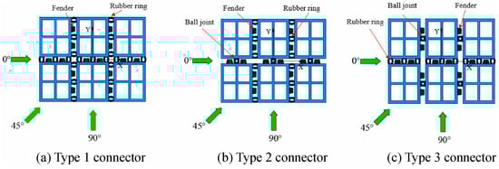 As demonstrated by [62], connectors and joints play a significant role in the hydrodynamics of FPV arrays. Following these findings, a study by [61] investigated different joint systems acting on a rectangular array. Three distinct joints were investigated—Type 1, employing rubber rings; Type 2, employing ball joints in the direction of wave propagation and rubber rings perpendicular; and Type 3, rubber rings in the direction of wave propagation and ball joints perpendicular to it. Figure 15 illustrates the connectors employed in the study. The findings revealed that type 2 was found to be the most effective in reducing motion response and mooring forces. The ball joint, in the direction of wave propagation, aided in reducing the rotational motion response and increased module interaction, consequently reducing the magnitude of forces transmitted to the mooring system.