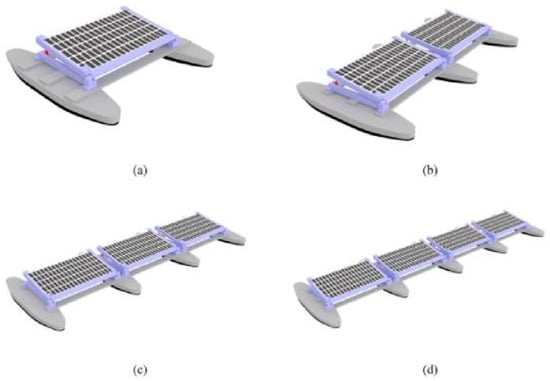 In a Class 2 type FPV, each PV panel has a dedicated pontoon used to provide buoyancy. An array of such FPVs is connected using hinge pins and numerous other connection mechanisms. Compared to a Class 1 category, a Class 2 FPV raises the panel’s height significantly above the water’s surface. To deploy this class of FPVs in nearshore and offshore conditions, the pontoon needs to be designed to withstand elevated wave heights. One of the first class 2 FPV systems was the Hydrelio [32], developed by the French company Ciel et Terre in 2011. Another example of such a system is provided in [33].