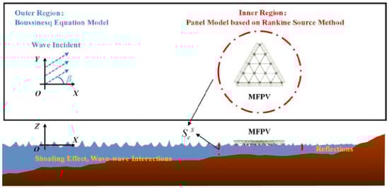 A pioneering study [72] performed simulations investigating the effect of seabed configuration, breakwater location and location within the bay. A novel technique, termed the ‘Hybrid Boussinesq Panel method (HBPM)’, was introduced. In this method, as illustrated in Figure 18, the domain is divided into two regions: (1) the outer region, characterised by wave propagation using the nonlinear Boussinesq model FUNWAVE-TVD, and (2) the inner region, which employs potential flow and the panel method. It was shown that an FPV should be placed close to the breakwater, avoiding areas near the mouth of the bay.