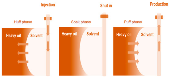Against this background, the focus is placed on CSI within the solvent-based category, which has gained attention for its simplicity, lower environmental impact, and effectiveness in heavy oil recovery. CSI cyclically injects solvent, followed by soaking and production, reducing oil viscosity, inducing oil swelling, and generating stable foamy oil, thereby improving reservoir fluid mobility and recovery efficiency [2,3].