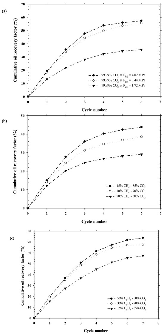 Effect of Key Operational Parameters on CSI Cumulative Oil Recovery: (a) CO2 injection pressure, (b) Concentration of CH4 in CH4/CO2 mixtures, and (c) Concentration of C3H8 in C3H8/CO2 mixtures [40].