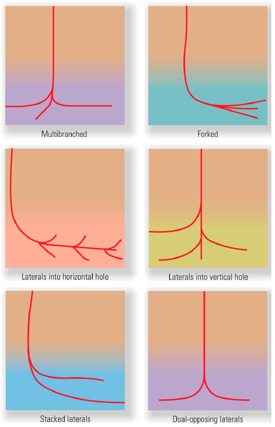 According to the arrangement of the main bore and lateral wells, MLWs can be categorized into six primary types as depicted in Figure 4 [65]: