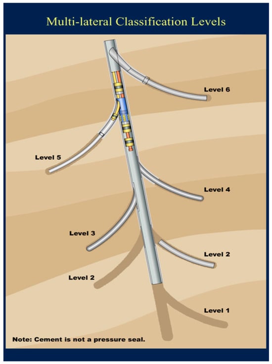 According to the complexity of the completion method and fluid control capability, MLW are classified into six levels (Level 1–Level 6) based on the API TAML standard. This classification is depicted in Figure 5 [69]. As the level increases, wellbore integrity, fluid control, and intervention capability are progressively enhanced [69]: