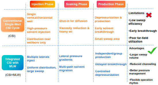 However, CSI faces challenges such as poor vertical solvent distribution in heterogeneous reservoirs, causing low sweep efficiency, early breakthrough, and reduced recovery. Although previous reviews have examined CSI and MLW separately, systematic evaluations that integrate both technologies, quantify potential performance improvements, and address implementation challenges are scarce. This review addresses this gap by exploring the integration of CSI with MLW to improve distribution by enlarging reservoir contact and optimizing flow paths. Based on recent experimental, theoretical, and numerical studies, key operational parameters are identified and the potential of MLW to address current limitations is demonstrated, offering guidance for future research and applications. The main contributions of this review are the following: