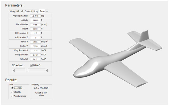 AID (Aircraft Intuitive Design) is integrated into MATLAB 2016a version, and the DATCOM connection is provided. Using the program, a 3D model of the aircraft is created first. The CG position is determined, and aircraft inertia and weight information are defined (