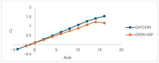 When comparing Open VSP and DATCOM decoders, a 12% difference in the maximum CL value was calculated.