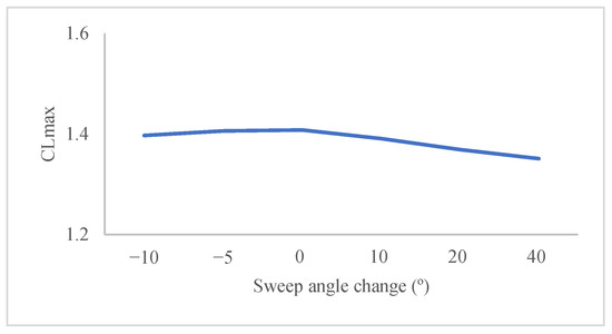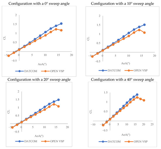 The maximum CL values obtained from DATCOM and OpenVSP solvers were compared for different wing sweep angles, and differences of about 10–14% were observed.