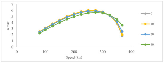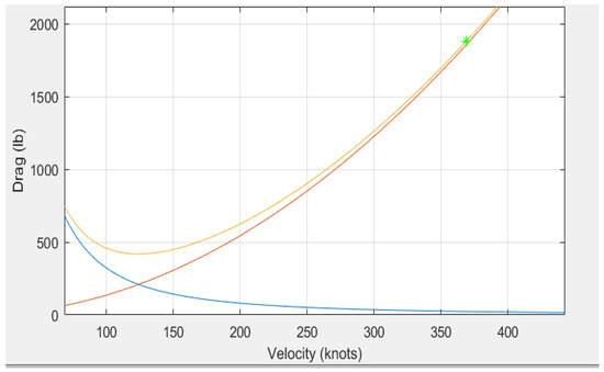 Figure 8 shows the visual representation of the resulting drag force. The blue lines represent induced drag, the red line represents parasitic drag, and the orange line represents total drag. The green asterisk shows the maximum drag value at the aircraft’s maximum speed.