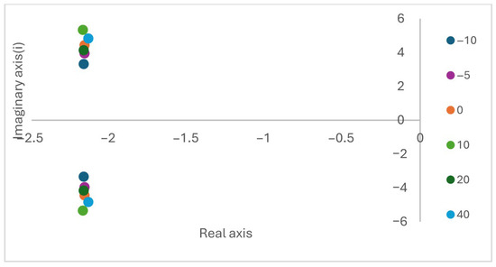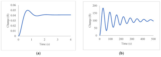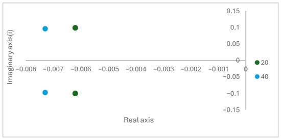 Equations (24) and (25) are used for the phugoid mode calculations. 0.0998 s−1 and 0.06272 are calculated. The characteristic equation for the phugoid mode can be defined as s2 + 0.0125s + 0.0099. The equation’s roots are found as λ3 = + 0.0993 i and λ4 = − 0.0993 i.