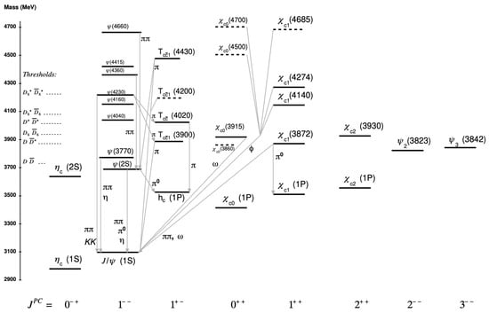 The first heavy quarkonium, , was discovered by the SLAC E598 and Brookhaven experiments in November 1974 almost simultaneously [19,20], which marked the “November Revolution”. Since then, charmonium spectroscopy has expanded rapidly: the SPEAR storage ring resolved the first radial excitation [21] and, through radiative transitions, the P-wave triplet [22,23,24,25]; subsequent experiments at DORIS and ADONE uncovered the vector state [26] and higher excitations [27], [27] and [25,28]. The known charmonium spectrum is summarized in Figure 1.