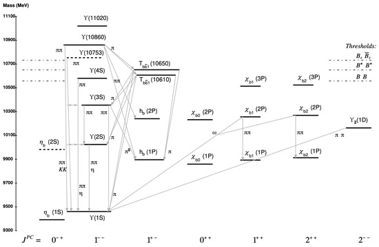 Representation of the bottomonium spectrum, adopted from the Particle Data Group 2024 Review [29]. Dashed lines denote states not yet experimentally established. Arrows denote the dominant hadronic transitions. For clarity, single-photon transitions such as have been omitted. The thresholds corresponding to a pair of ground-state open-bottom mesons are indicated in the figure. Decays into open-flavor final states are not shown. Moreover, the transitions have also been reported.