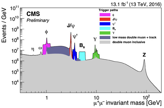 Dimuon mass spectrum of CMS in 2016 collisions at 13 TeV, corresponding to an integrated luminosity of 13.1 fb−1. Colored shaded bands indicate the mass windows of dedicated trigger paths: (magenta), (red), (blue), (cyan), and (green). The dark and light gray bands show the acceptances of the low-mass dimuon+track triggers and inclusive dimuon triggers, respectively [40].