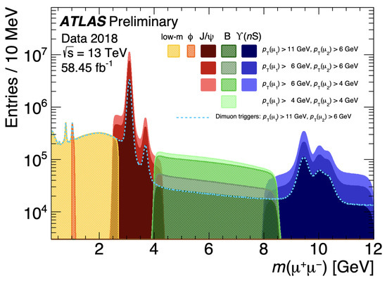 Dimuon mass spectrum of ATLAS in 2018 collisions at 13 TeV, corresponding to an integrated luminosity of 58.45 fb−1. Shaded histograms show contributions from low-mass (yellow), (red) and (green and blue) resonances under different muon transverse-momentum selections. The cyan dashed curve indicates the dimuon trigger thresholds [41].