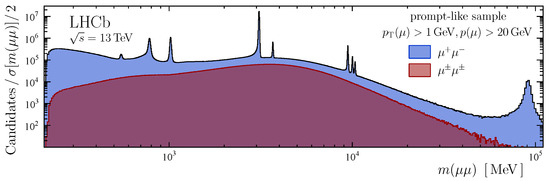 Dimuon mass spectrum of LHCb at 13 TeV divided by opposite or same sign muon pair [42].