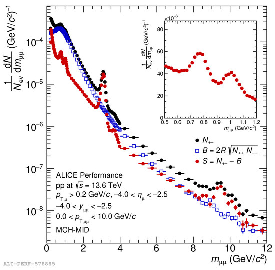 Dimuon mass spectrum in collisions at 13.6 TeV recorded by ALICE. Black points show opposite-sign pairs . Blue open squares denote the like-sign combinatorial background . Red circles are the signal . The inset zooms the low-mass region () [43].