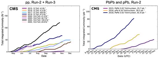 Integrated luminosity recorded by the CMS experiment in , pPb and collisions during LHC Run-2 and Run-3. Left: the integrated luminosity delivered by the LHC and recorded by CMS during collisions in Run-2 and Run-3. Right: the integrated luminosity for and pPb collisions recorded by CMS in Run-2 [44,45].