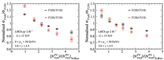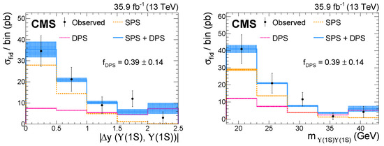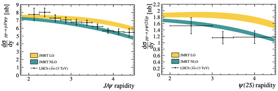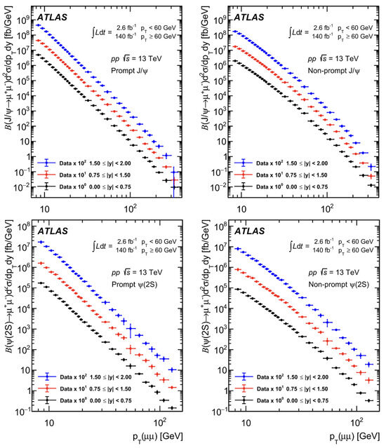 In collisions at , ATLAS, CMS, and LHCb have measured differential cross-sections of and , which were reconstructed via their dimuon decays [52,53,56]. In ATLAS and CMS measurements, the differential production cross-sections are measured as functions of rapidity y and transverse momentum and compared to theoretical predictions. In contrast, the LHCb analysis provides the cross-section as a function of y only.