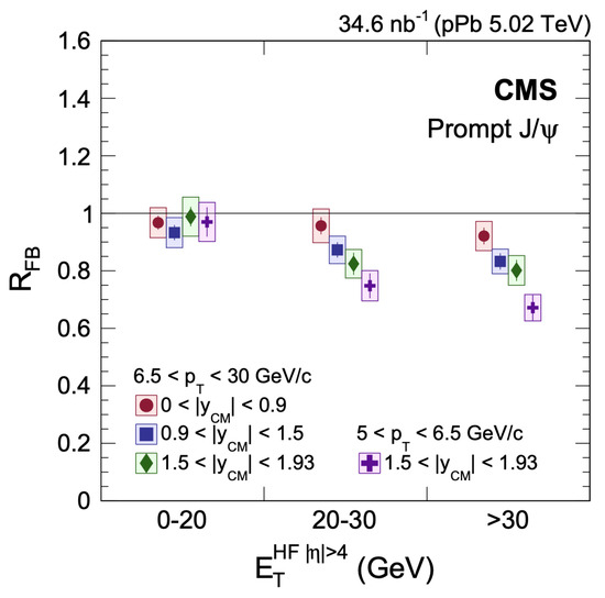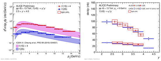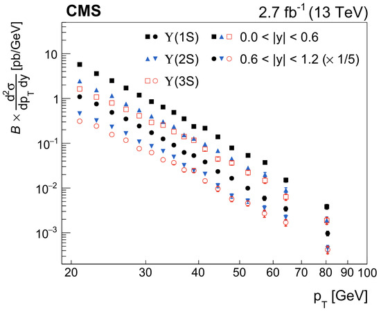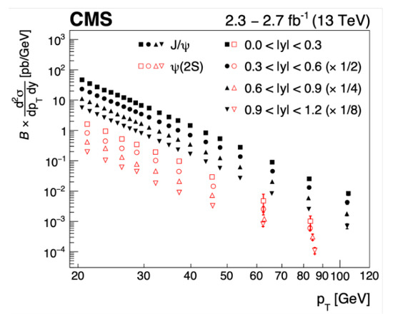 In and collisions at , CMS measured the yields of via decays with integrated luminosities of 166 μb−1 and 5.4 pb−1, respectively (Figure 20) [91]. The differential cross-sections were obtained for and .