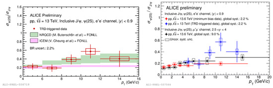 In collisions at and , ALICE measured the inclusive cross-section ratio at midrapidity () in the channel and forward rapidity () in the channel [57]. The results are shown in Figure 11.