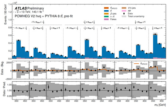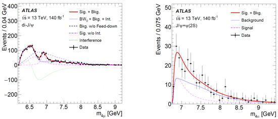 The CMS and ATLAS collaborations followed a similar analysis strategy. In their analyses, candidates were reconstructed by the channel using the collision dataset collected at 13 TeV, and the distribution was examined. Several background sources were considered, including non-resonant production, misidentified candidates, and other processes. All background component distributions were modeled by MC simulations. The possible state was also simulated to estimate its production cross-section. To measure the spin of possible quasi-bound-states, candidates were separated into nine categories according to two angular observables and , which characterize the angle between two charged leptons in the final state [4]. Fits were applied across all nine categories incorporating contributions from both backgrounds and the hypothetical state. The fits conducted by the ATLAS collaboration are illustrated in Figure 15.