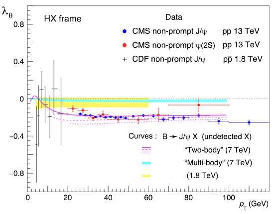 - Faccioli, P.; Lourenço, C. On the polarization of the non-prompt contribution to inclusive J/ψ production in pp collisions. J. High Energy Phys. 2022, 10, 005. [Google Scholar] [CrossRef]