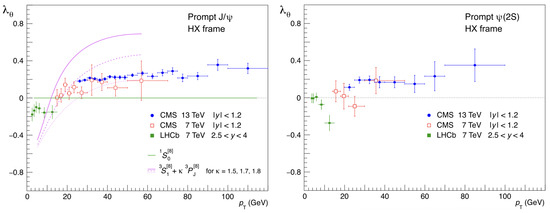 Prompt (left) and (right) polarization parameter as a function of in collisions at measured by CMS [85]. Compared with CMS [76] and LHCb [78] results at . Vertical bars indicate total uncertainties.
