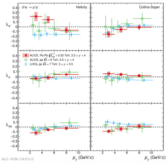 - ALICE Collaboration. J/ψ polarization in pp collisions at = 7 TeV. Phys. Rev. Lett. 2012, 108, 082001. [Google Scholar] [CrossRef]