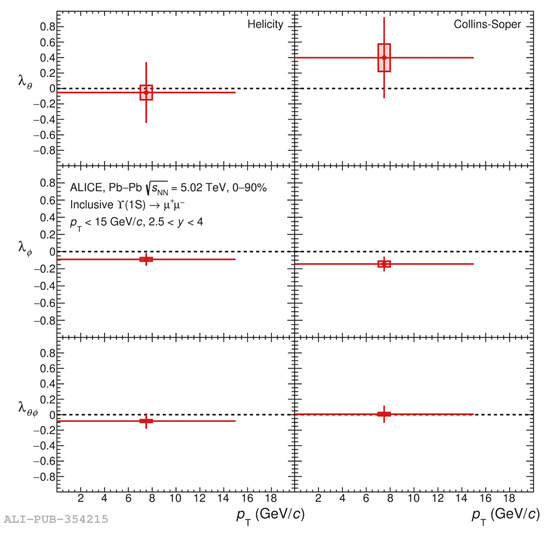 In heavy-ion collisions, polarization can also probe the properties of the quark–gluon plasma, and it has been hypothesized that the strong magnetic field in the early stages may align quarkonium spins. In ALICE, the polarization of and mesons is extracted from the anisotropies in the angular distribution of their decay muons (Figure 18 and Figure 19) [88]. This contribution reports the -differential polarization in collisions at at forward rapidity (), presented in two reference frames and compared with earlier measurements.