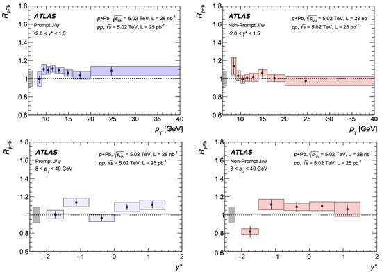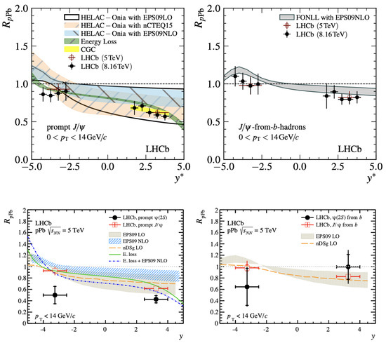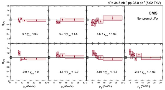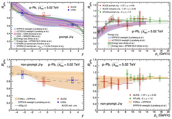 - CMS Collaboration. Measurement of prompt and nonprompt J/ψ production in pp and pPb collisions at = 5.02 TeV. Eur. Phys. J. C 2017, 77, 269. [Google Scholar] [CrossRef]