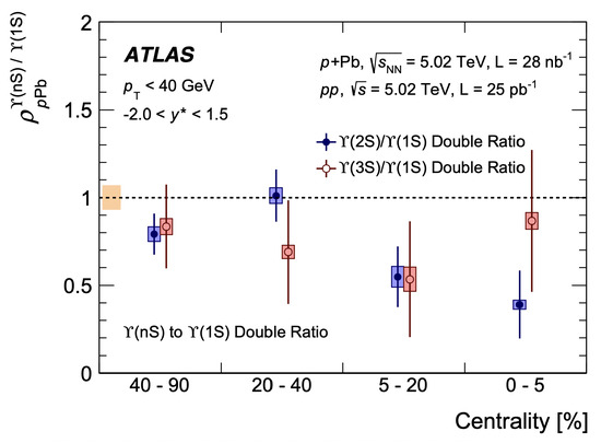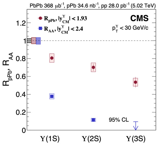 - CMS Collaboration. Nuclear modification of Υ states in pPb collisions at = 5.02 TeV. Phys. Lett. B 2022, 835, 137397. [Google Scholar] [CrossRef]