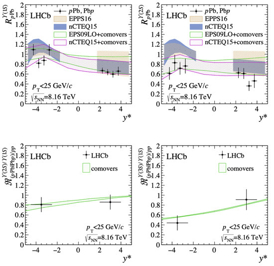 - Ferreiro, E.G.; Lansberg, J.P. Is bottomonium suppression in proton-nucleus and nucleus-nucleus collisions at LHC energies due to the same effects? J. High Energy Phys. 2018, 10, 094. [Google Scholar] [CrossRef]