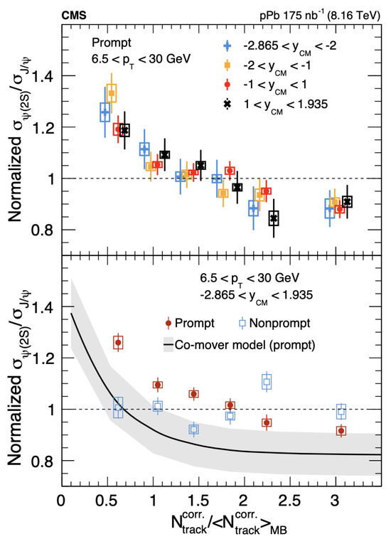 - CMS Collaboration. Observation of the charged-particle multiplicity dependence of σψ(2S)/σJ/ψ in pPb collisions at = 8.16 TeV. arXiv 2025, arXiv:2503.02139. [Google Scholar]