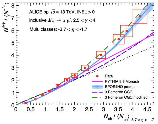 - ALICE Collaboration. Multiplicity dependent inclusive J/ψ production at forward rapidity in pp collisions at = 13 TeV. arXiv 2025, arXiv:2504.00686. [Google Scholar]