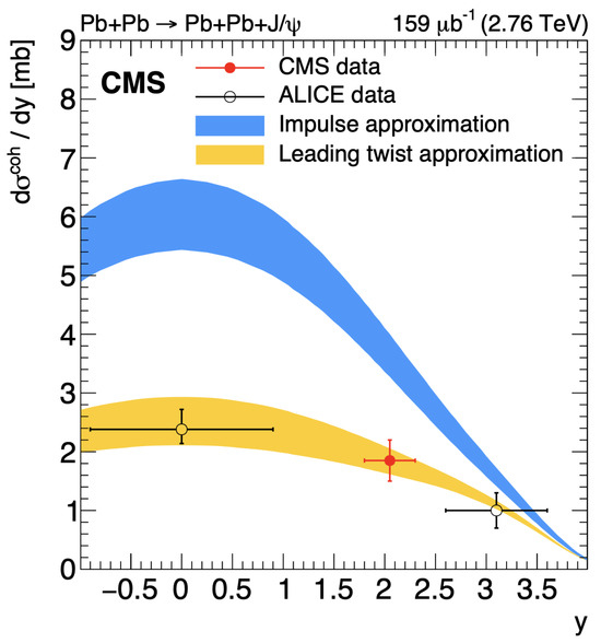 - CMS Collaboration. Coherent J/ψ photoproduction in ultra-peripheral PbPb collisions at = 2.76 TeV with the CMS experiment. Phys. Lett. B 2017, 772, 489. [Google Scholar] [CrossRef]
